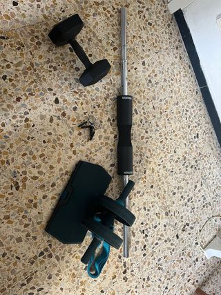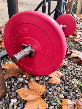Set de pesas con barra larga y mancuernas, ideal para entrenamientos en casa. Incluye varios discos para ajustar el peso. El set es de 60 kg Incluye: - Barra larga - Dos mancuernas cortas. - Discos de pesa de diferentes tamaños: - 2 discos de 10 kg - 2 discos de 5 kg - 4 discos de 2,5 kg - 4 discos de 1,25 kg - 6 cierres de estrella Los discos son de plástico resistente, duraderos y a su vez más silenciosos y amigables con el suelo que los de metal. Ideal para tener en casa!
