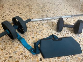 Pack de equipamiento para entrenar en casa. Incluye una mancuerna, una barra y una rueda abdominal. - Mancuerna 10 kilos hexagonal negra. - Barra de pesas 120 cms con protección. - Rueda abdominal con banda de resistencia.( desmontable) puede usarse con o sin la banda. 2 cierres para barra