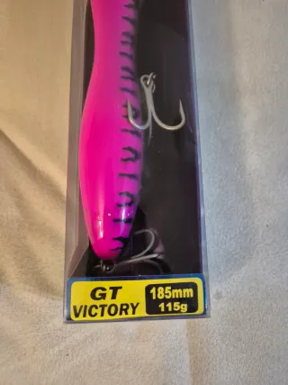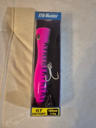 Se vende señuelo de pesca tipo popper de la marca Pro Hunter. - Modelo: GT Victory. - Color: Rosa con rayas negras. - Longitud: 185mm. - Peso: 115g.