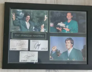 Colección The Spanish Masters con fotos y firmas de golfistas españoles. - Incluye fotos de José María Olazábal, Sergio García y Seve Ballesteros. - Firmas de José María Olazábal (1994, 1999). - Firma de Sergio García (2017). - Firmas de Seve Ballesteros (1980, 1983) Tamaño de la foto 20*29 cm Peso 350 gramos del cuadro País origen España Tres jogadores españoles famosos de golf Con las tres firmas originales y auténtica de cada jugador Enmarcado con un bonito cuadro de color negro Dimensiones del cuadro 33*24*2cm