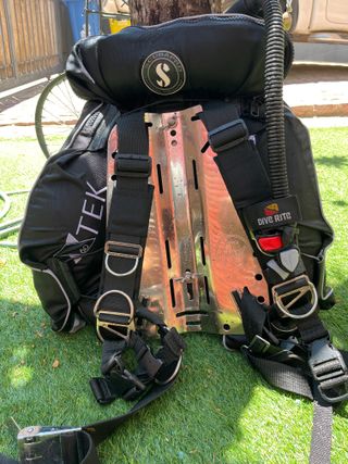 Sistema modular, resistente, botella simple o doble, con distribución del peso y posición estable bajo el agua. ALA: SCUBAPRO X-TEK HORSESHOE 60lbs. Exterior 1680D Ballistic nylon, vejiga 420D nylon, SCUBAPRO Balanced Power Inflator (BPI) y sistema Bungee. 60lbs/27kg de elevación. Valorada en 340€ PLACA: OMS de acero inoxidable 3mm, alas anguladas, múltiples puntos de anclaje. Dimensiones 39,5×26,5cm, peso 2,20kg. Valorada en 130€ ARNÉS: DIVE RITE TransPlate, híbrido tipo mochila, fabricado con nylon balístico y acero inoxidable de grado marino. Valorado en 140€. Adaptador monobotella y 2 cinchas porta botella, OMS de acero.
