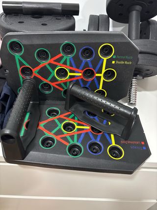Set de mancuernas ajustables con barra y discos de pesas para entrenamiento en casa. - Mancuernas con discos intercambiables. - Incluye barra para ejercicios. - Discos de diferentes pesos. - Tabla para ejercitar pecho, hombros y espalda (sin estrenar) - Bandas elásticas.