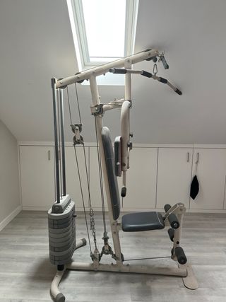 Máquina de pesas con varios años de uso, pero en buen estado de funcionamiento. Todos los mecanismos operan correctamente y permiten entrenar con normalidad. Incluye los módulos habituales para trabajo de pecho, jalón (espalda) y piernas en la parte inferior, cubriendo los principales grupos musculares. El sistema de poleas y pesos funciona de forma fluida, sin bloqueos, y permite ajustar la carga según el ejercicio.