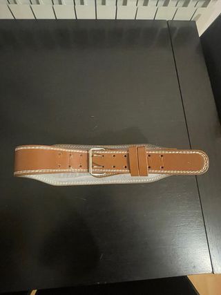 Cinturón lumbar de piel para levantamiento de pesas. - Material: Piel. - Color: Marrón. - Cierre ajustable con hebilla.
