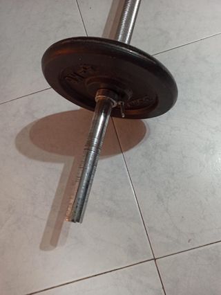 Set de barra de pesas con discos. - Barra de metal. - Discos de peso de hierro fundido La barra mide 1,20 y cada disco 5 kilos.