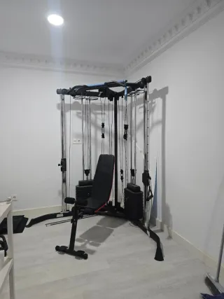 Sistema de gimnasio en casa con múltiples funciones para entrenar todo el cuerpo. Ideal para tu rutina de ejercicios. CASI NUEVA 100KG pesas Está medio desmontada, puede ver en la segunda imagen Banco ajustable como regalo Lo compramos por 1100€ Multi-functional home gym system for a full-body workout. Ideal for your exercise routine. LIKE NEW 100kg weights It is half dismantled , you can see on the second picture Adjustable bench included as a gift We bought it for 1100€