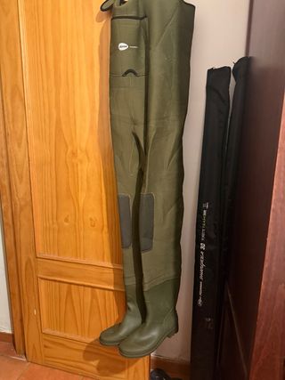 Vadeador de pesca Evia Harris en color verde. Talla 44. - Material resistente. - Botas integradas. Vadeador en perfecto estado utilizado muy poco, a pesar de los años que tiene esta perfecto sin ningun rasguño ni perforación es la talla 44.siempre guardado en bolsa