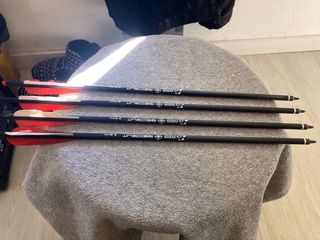 4 flechas de caza usadas para tiro recreativo no mas de tres veces para pruebas de fuerza.long 48 cm. Diametro 8,8. Peso 24 gr
