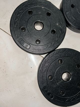 Discos de pesas de 1kg, cuatro en total. Están en buen estado, aunque muestran señales de uso. Ideales para principiantes o para complementar tu equipo de entrenamiento. Cada una 3€ las 4 por 10€ - 2 discos blancos - 1 disco azul - 1 disco rojo - Material: metal