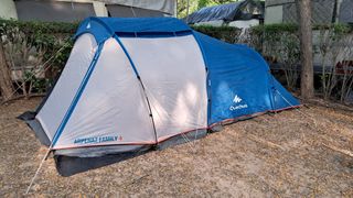 Preciosa tienda de campaña familiar Arpenaz Family 4 de Quechua, ideal para acampar con la familia. - Capacidad para 4 personas. - Dimensiones: 260cm x 225cm x 175cm. - Peso: 6.7 kg. - Se encuentra en perfecto estado.