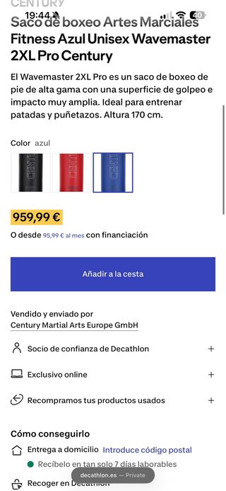 Vendo saco de boxeo Century Wavemaster 2XL Pro (170 cm). Usado máximo 10 veces, siempre en interior, en estado impecable. Ideal para boxeo, kickboxing y artes marciales. Solo recogida en mano por tamaño/peso.