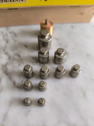 Precio a convenir, sueltas o todas. Conjunto de pesas metálicas de diferentes tamaños. Ideales para calibrar o para uso en laboratorio. - Pesas de metal. - Variedad de tamaños. 50,20,10,5,2.gramos