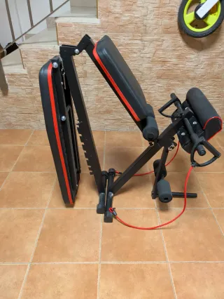 Banco de pesas diseñado para ejercicios de abdominales y entrenamiento general. - Estructura metálica. - Acolchado en zonas de apoyo. - Asas para sujeción. Telefono 643579636 (Por si no llegan los mensajes en wallapop.)
