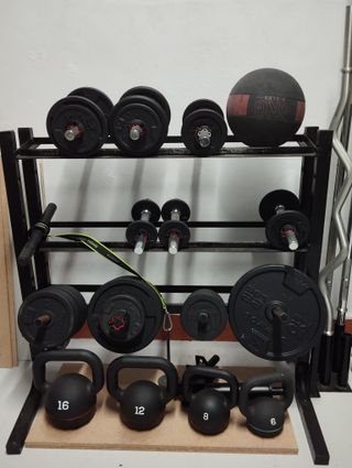 Conjunto de equipamiento para entrenamiento en casa o gimnasio. - 3 pares de mancuernas. - Kettlebells de 6 - 8 - 12 y 16Kg. - Barras de pesas diámetro 28 de 120,155,200cm y curva de 120cm. - Discos de pesas: 12-2Kg, 23-1Kg, 4-0,5Kg, 4-5Kg, 2-10Kg. - Balón medicinal 4Kg. - Maneral para antebrazos. Se regala mancuernero casero y soporte de barras. Todo en perfecto estado usado sólo en casa. No interesan cambios. Sólo entrega en mano.