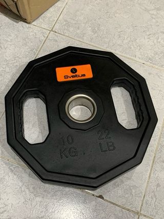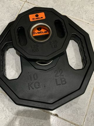 Set de discos de pesas Sveltus. - Disco de 10 kg (22 lb). - Disco de 1.25 kg (2.75 lb). - Diseño octogonal con agarres. - Centro con logo Sveltus.