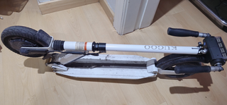 Patinete eléctrico Kugoo S1 en color blanco. Peso asequible unos 10kg, por lo que se puede llevar en la mano. - Diseño plegable para facilitar su transporte. - Ruedas de goma. - Manillar ajustable en altura. Prefiero no enviar, aunque pese poco, correos cobra por peso.