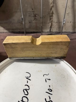 Soporte de madera con hendidura central y base de acero inoxidable pesada, diseñado para apoyar cañas de pesca.
