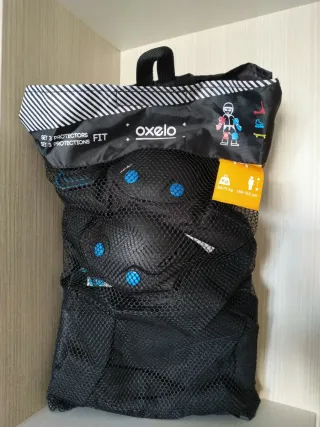 Vendo set completo de protecciones de la marca Oxelo, ideal para patinaje, skateboard o scooter. El pack incluye las 3 piezas esenciales: rodilleras, coderas y muñequeras. Son de la talla M, recomendadas generalmente para usuarios con un peso aproximado de 50 a 75 kg. Cuentan con cierres de velcro ajustables para un ajuste seguro y cómodo. El set está en muy buen estado, usadas una vez.
