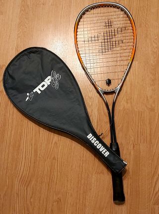 Raqueta de aluminio. de 210 gramos de peso. 500 cm² de superfie de la pala. 70 cm de longitud desde el mango al final de la pala. La tensión de las cuerdas está entre 20 y 23 kg. Viene con funda y la raqueta está unida a ella. Con las etiquetas. A pesar de que nunca se ha usado, el mango presenta un ligero desgaste.
