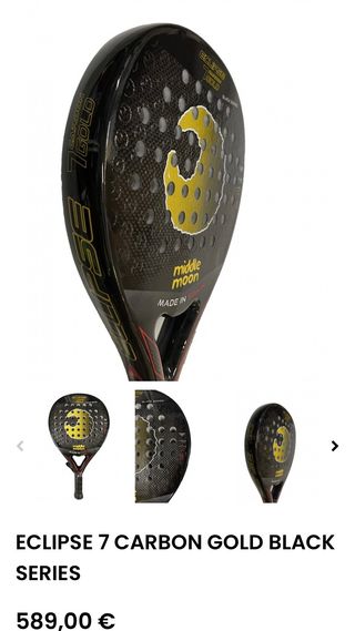 La MIDDLE MOON ECLIPSE 7 CARBON GOLD BLACK SERIES es una pala completa. Fabricada en formato redondo, fibra de carbono en su totalidad y superficie rugosa. Diseñada para jugadores que busquen control sin perder nada de potencia. Incorpora las tecnologías más avanzadas para reducir lesiones de codo. Compartir Tuitear Pinterest DETALLES DEL PRODUCTO Ficha de datos Peso 350-380 Forma Redonda Plano Carbono 3k Marco Carbono Núcleo Ultra soft rubber tech Potencia 9 Control 10 Grosor 38 mm Tiene pocos días de uso Esta como nueva Aceptamos ofertas