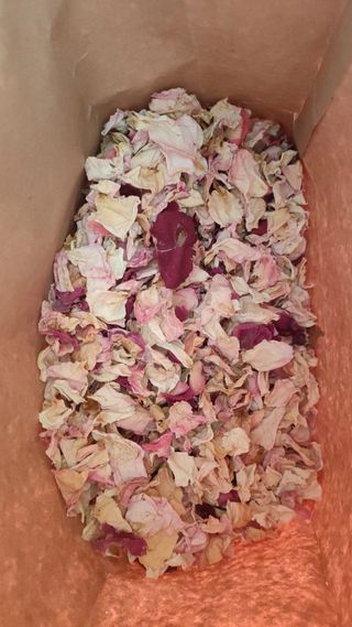 Pétalos naturales de rosa Cogidos uno a uno y secado en casa cuidadosamente Los usé para los conos de la boda, mezclados con arroz. Las fotos quedan chulísimas porque los pétalos tardan en caer Tiene pétalos de rosas de diferentes colores Huelen a rosas todavía Pesan 114 gramos en total