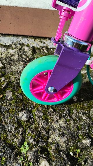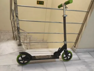 Patinete infantil plegable, estable y resistente, ideal para niños. Características: Sistema plegable, fácil de transportar y guardar Ruedas grandes con recubrimiento de goma para mejor estabilidad Manillar regulable en altura Plataforma antideslizante Estructura robusta Certificación EN14619:2004 Peso máximo recomendado: 100 kg Estado general bueno, con signos normales de uso, tal y como se aprecia en las fotos. Funcionamiento correcto.
