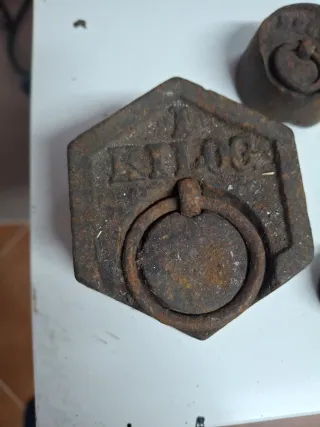 Conjunto de cinco pesas de diferentes tamaños, ideales para coleccionistas o para uso decorativo. - La pesa más grande tiene un peso de 1 kg. - Fabricadas en metal con un acabado rústico. - Incluye una pesa hexagonal y cuatro pesas cilíndricas.