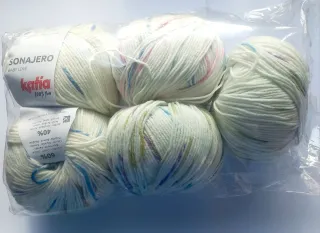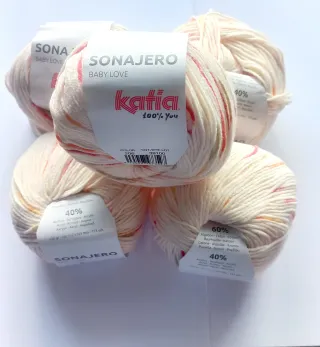 Lote de 10 ovillos de lana Katia Sonajero Baby Love. - Color: 5 del nº 206, 2 del 208, 2 del nº 203 y 1 del nº 202 - Composición: 60% Algodón, 40% Acrílico. - Cada ovillo pesa 50 gr y mide 145 mts / 153 yds. Posibilidad de hacer el lote mas pequeño.