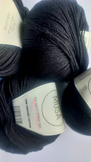 Lote de ovillos de algodón orgánico de la marca Musa. - Cada ovillo pesa 50 gramos. - Cada ovillo tiene 180 metros (196 yds). - 100% Algodón Orgánico. Marca Española