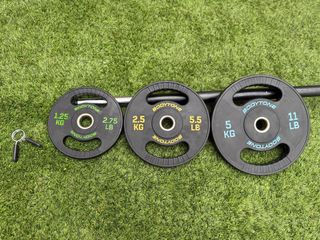 Set completo de pesas de la marca Bodytone, ideal para Pump, fitness o entrenamiento de fuerza en casa. Los discos están revestidos en goma de alta calidad para proteger el suelo y reducir el ruido. El pack incluye: • Barra de acero: Con agarre cómodo y robusto. • Discos Bodytone (par de cada uno): • 2 x 5 kg (Azul/11 lb) • 2 x 2.5 kg (Amarillo/5.5 lb) • 2 x 1.25 kg (Verde/2.75 lb) • Total en discos: 17.5 kg. • Cierres de seguridad: Pinzas tipo muelle para fijar los discos fácilmente. Estado: Muy bien cuidado. Los discos están impecables y la barra no tiene óxido. Siempre guardado en interior.
