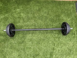 Set de pesas estilo Body Pump, ideal para entrenamientos de alta repetición, tonificación y clases dirigidas en casa. Los discos tienen un diseño ergonómico con agarres para usarlos también como pesas individuales. El pack incluye: • Barra con revestimiento: Agarre cómodo y antideslizante. • Discos de colores (revestidos en goma): • 2 x 5 kg (Naranja). • 2 x 2,5 kg (Verde). • 2 x 1,25 kg (Amarillo). • Total en discos: 17,5 kg. • Cierres de pinza: 2 unidades para un cambio de peso rápido y seguro. Estado: En buen estado, con marcas normales de uso que no afectan a su funcionamiento. Perfecto para montar tu propio gimnasio en casa.