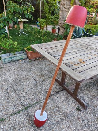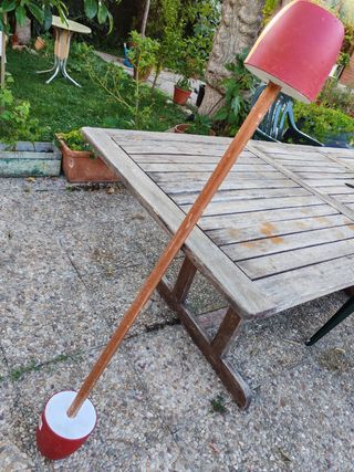 Pesa casera hecha a mano. - Mango de madera. - Base y parte superior rojas.