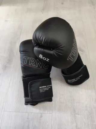 Guantes de boxeo marca TRNG de Decathlon, con un peso de 8oz. Ideales para iniciación. - Color negro. - Cierre de velcro ajustable. - Diseño para entrenamiento.