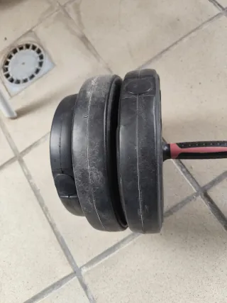 Kit de mancuernas Domyos de Decathlon con un peso total de 20 kg (44 lb). Incluye todo lo necesario para entrenar en casa. se usaron dos veces,fue un regalo están impolutas. - 2 barras de mancuerna. - 4 discos de 2 kg. - 4 discos de 1 kg. - 4 cierres de seguridad.