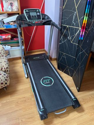 Cinta de correr Cecotec Fit en buen estado. - Diseño plegable para fácil almacenamiento. - Superficie de carrera amplia. - Pantalla digital con información de entrenamiento. - Sistema de amortiguación para mayor comodidad. - Con libro de instrucciones y juego de herramientas. -Hasta 18 km por hora, 3cv, superficie de carrera 42x1,30. - Peso de la maquina 62 kilos