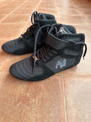 ¡Como nuevas! Vendo botas de entrenamiento de alta gama marca Gorilla Wear, modelo Perry High Tops Pro en color negro total (Black/Black). Son ideales tanto para boxeo como para levantamiento de pesas (culturismo), ya que ofrecen una estabilidad increíble y un agarre superior en el suelo. • Estado: Excelente (poco uso, ver fotos de la suela y el interior). • Talla: 40 EUR (7 US Men / 8.5 US Women / 6 UK). • Características: • Diseño ultra ligero para mayor movilidad. • Cierre de cordones combinado con tira de velcro en el tobillo para un ajuste perfecto y protección. • Suela plana y antideslizante. • Materiales transpirables de alta