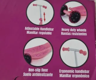 Patinete color negro y fucsia, con plataforma antideslizante, pedal de freno trasero y plegable de manera sencilla con un solo clic. Manillar con fundas de goma para mejor agarre. Manillar ajustable en 3 alturas. Peso máximo 100 kg. Muy buen estado. Recoger en Rivas.