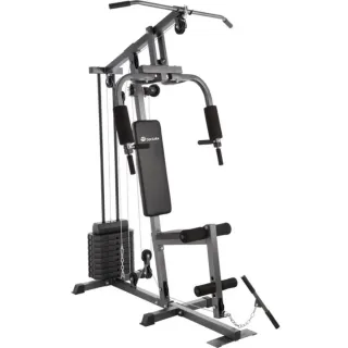 Banco de pesas multifunción para entrenar en casa. Estructura robusta y acolchado cómodo. - Barra de dominadas integrada. - Poleas para diferentes ejercicios. - Soporte para pesas.o - Acolchado en asiento y respaldo. - Hasta 50 kg. - 12 torres de ejercicios diferentes para brazos, piernas, pecho, espalda y abdomen
