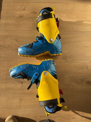 Botas de esquí de montaña Dynafit TLT6 en color azul y amarillo. La zapatilla de touring Dynafit TLT 6 Mountain CL ofrece un peso mínimo con el máximo rendimiento. La TLT 6 Mountain CL es la elección perfecta para los esquiadores de montaña ambiciosos que buscan una bota ligera para la subida, pero no quieren perderse la diversión del descenso. Botas de esqui usadas pero en buen estado. Las ralladuras externas son tipicas del uso de este material. Botas que merecen la pena para empezar teniendo en cuenta la calidad de la misma. Clásica bota con la mejor calidad y polivalencia de la marca Dynafit. Un 27 en ski. 42