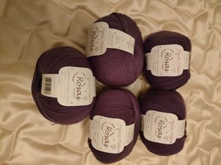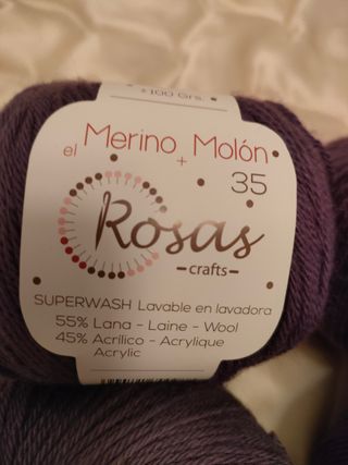 Conjunto de cinco ovillos de lana Merino Molón en color morado. - Marca: ROSAS - Composición: 55% Lana, 45% Acrílico. - Tratamiento Superwash. - Cada ovillo pesa 100 gramos. - Longitud por ovillo: 240 metros.