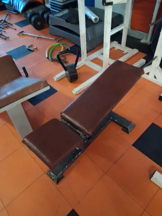 Banco de pesas con asiento y respaldo reclinables. - Estructura metálica resistente. - Tapicería de cuero sintético marrón.