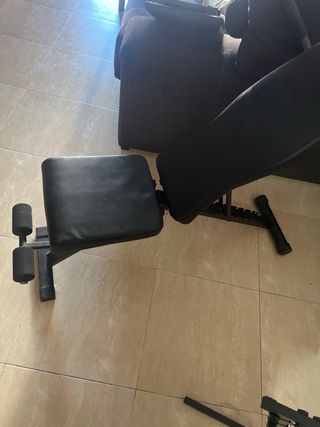 Banco de pesas Domyos BM 160 con barra de 150cm, 2 discos de 10Kg, 2 discos de 5Kg con retenciones laterales. Espaldero regulable en altura horizontal y tres elevaciones más. Mesa de curl de bíceps desmontable. Soporte articulable de curl femoral con barra para discos. En perfecto estado. Únicamente entrega en mano.