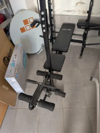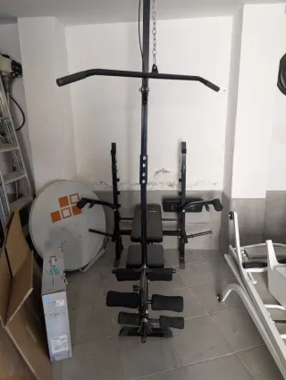 Vendo gimnasio casero casi nuevo. Incluye: - 134 kg en discos de hierro fundido de varios tamaños (1, 2, 3, 4, 5 y 10 kg). - Estructura de press de banca robusto. - 2 barras largas (rosca + cierre). - Mancuernas ajustables + mancuernas fijas de 3 kg. - Soporte de hierro para guardar pesas. - Sistema de poleas con cuerda para bíceps y tríceps (ideal para jalones).