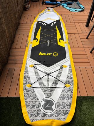 Tabla hinchable ZRAY D1 de 10'10 pies, modelo x2. Diseño moderno con colores amarillo, negro y gris con estampado. PRECISA REPARACIÓN DE PINCHAZO EN LATERAL de 30 cms. Medidas: 305 x 81 x 15 cm Ideal para 1 adulto Peso máximo soportado: 120 kg Peso vacío: 9 kg Para nivel básico-intermedio Opción de convertirse en Kayak Incluye bolsa de transporte Premium e hinchador