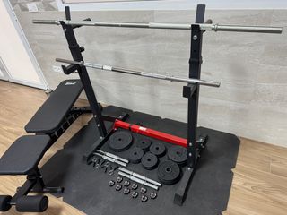 Equipo de musculación completo para entrenar en casa. Incluye banco ajustable, barras y discos.Set compuesto por soporte multifuncional ajustable para barras de pesas compuesto por una barra de 1,2 metros y otra de 1,55 metros de longitud, con dos discos de 5kg y banco de musculación. También se añaden 4 mancuernas de 10 kg con un total de 16 discos de 1kg y 8 discos de 2kg, se incluyen 10 abrazaderas de cierre rápido. - Banco de pesas con múltiples inclinaciones. - Barra larga y cortas. - Discos de diferentes pesos. - Abrazaderas para barras.