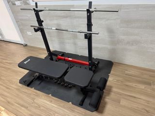 Equipo de gimnasio para entrenar en casa. - Banco con respaldo ajustable. - Soporte para pesas. - Rodillos para ejercicios de piernas.