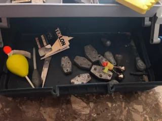 Caja de pesca con varios compartimentos y accesorios para la pesca. - Flotador amarillo. - Plomos de pesca. - Anzuelos. - Hilo de pesca. - Tijeras pequeñas. - Pesos Recoger en Alcàsser.