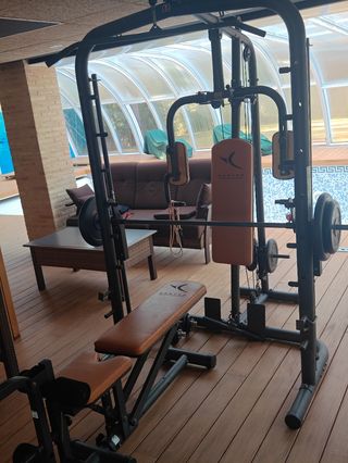 Máquina de ejercicios multifunción para entrenar en casa. Permite realizar una gran variedad de ejercicios. - Estructura robusta de acero. - Asiento acolchado. - Incluye pesas.