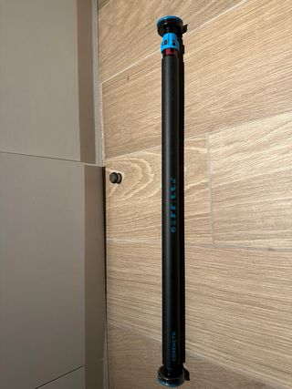 una barra de dominadas que se fija y se quita con o SIN tornillos, para trabajar la parte superior del cuerpo. peso máx. sin tornillos 100 kg, con tornillos 120 kg - Longitud ajustable hasta 70 cm. - Mecanismo de bloqueo para mayor seguridad. - Acabado en negro con detalles en azul