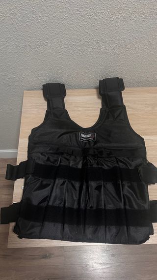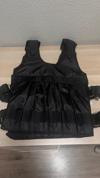 Chaleco lastrado de color negro, diseñado para entrenamiento deportivo. Fabricado en material textil resistente ya que soporta hasta 50kg. Cierre ajustable con velcro y con múltiples compartimentos para peso. No incluye el peso, solo el chaleco